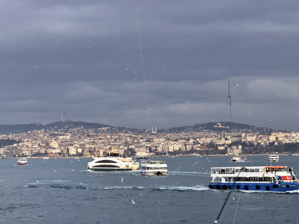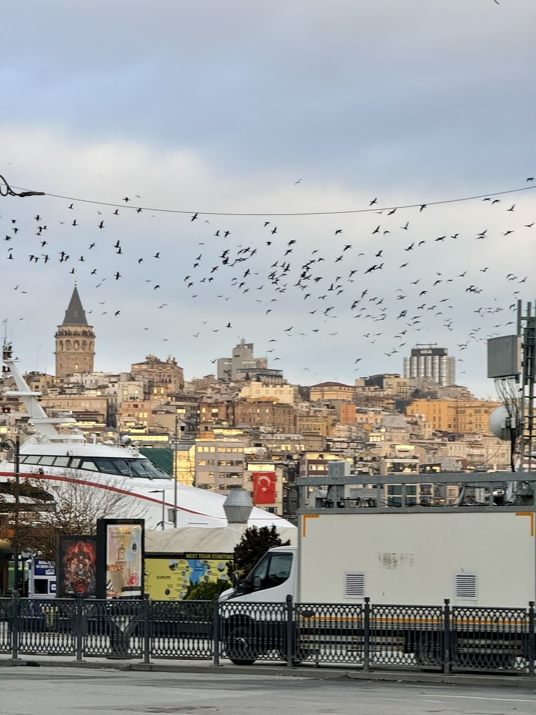 餐厅位于屋顶,可以俯瞰整个海峡,圣索菲亚大教堂和蓝色清真寺,其中的一大特色就是喂海鸥。早餐在不久前吃的都不算太饿,就点了咖啡和土耳其的传统甜点Baklava和口蘑砂锅Mushroom Casserole,小刘点杯热巧克力暖身。Baklava是用层层叠叠的酥皮包裹着碎坚果和蜂蜜糖浆制成,甜到极致配上土耳其咖啡正好。口蘑砂锅则是用新鲜的口蘑和奶酪烤制,每一颗蘑菇在冷风中都给胃部带来温暖,小刘不吃的芝士自然也被我给风卷残云。楼顶的风景真正的很好,风也很大,小刘右手戴着手套左手握着我的手放在兜里,一个眼神让我心动不已自觉戴上了另一只手套,总是有些叛逆别扭不愿顺应却又很容易被无意说服。 普鲁士蓝的海面上漂浮着几只渡轮,海鸥们的胸脯个个都是饱满有型,在空中盘旋还是很有边界感,没有直接飞来抢食。吹了会冷风后便结账去旁边的天台喂海鸥,顾客没吃完饭的食物服务员都会收集起来放在一个大盒子里,游客可以自取喂海鸥。又菜又爱玩的小刘还没举起叉子薯条就被海鸥叼走了,甚至毫不客气了踩了脚她的脑袋,笑晕。玩毕就下楼去蓝色清真寺参观,队伍很长倒也排的很快,