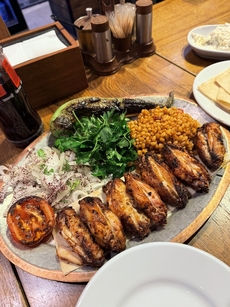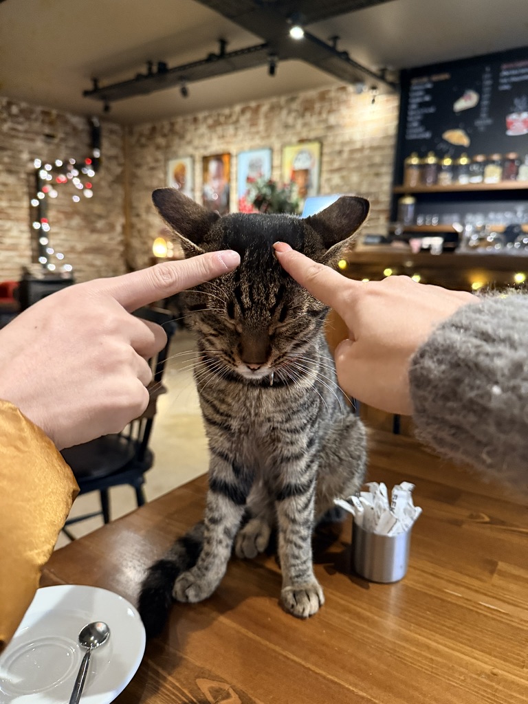 酒店的早餐并不全面,爱咖啡的自然还是连喝两杯(把小刘的一杯给喝了)。磨磨蹭蹭到了11点半才出门,小刘一件熨烫整齐没有一丝皱褶的米白色毛呢大衣配咖色围巾下藏着加厚秋裤套进两双袜子,宽松的牛仔裤和一双白鞋让一切都恰到好处。出酒店后是一个巨大的长下坡,下坡时她牵着我蹦蹦跳跳的笑着露出虎牙,那一刻我有些恍惚,她真可爱。上午的目的是蓝色清真寺和Seven Hills Restaurant,距离不远我们选择散步。一路上看见了很多猫猫,小刘拿着我的手机一路四处拍照,她真的很擅长捕捉光和影。路过的索菲亚大教堂正在装修,四周搭起了脚手架依然挡不住它的宏大。我们运气很好,这是一个晴朗的冬日,阳光明媚但不刺眼很舒服。蓝色清真寺前的广场十分适合散步,适合练习给小刘拍照,游客眼中一对普普通通的情侣在这积攒了很多美好回忆。中午正值信徒祷告时间,我们便先去了Seven Hills Restaurant吃午餐。